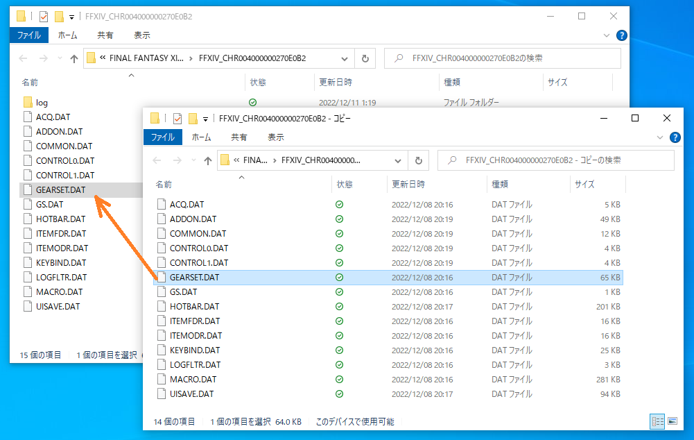よく見ると「GEARSET(ギアセット).DAT」ってのがあるので、これをコピー先キャラクターフォルダのバックアップから上書きして復元できました。