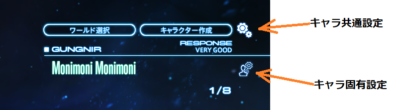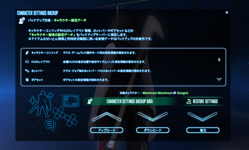 ちなみに上の設定アイコンはキャラクター共有設定、下のキャラクター名横にあるアイコンからバックアップ画面を呼び出せばキャラクター固有の設定をバックアップ、レストアできる。