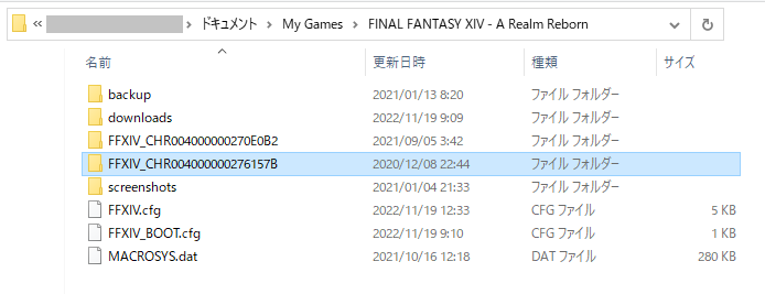 といっても手順は簡単で、FF14 をインストールしてキャラメイクすると、ドキュメントフォルダに「My Games」というフォルダが作られます。その中の「FFXIV_CHRxxxxxxxxxxxxxxx」のフォルダ内にキャラクターの設定ファイルが詰まっているので、